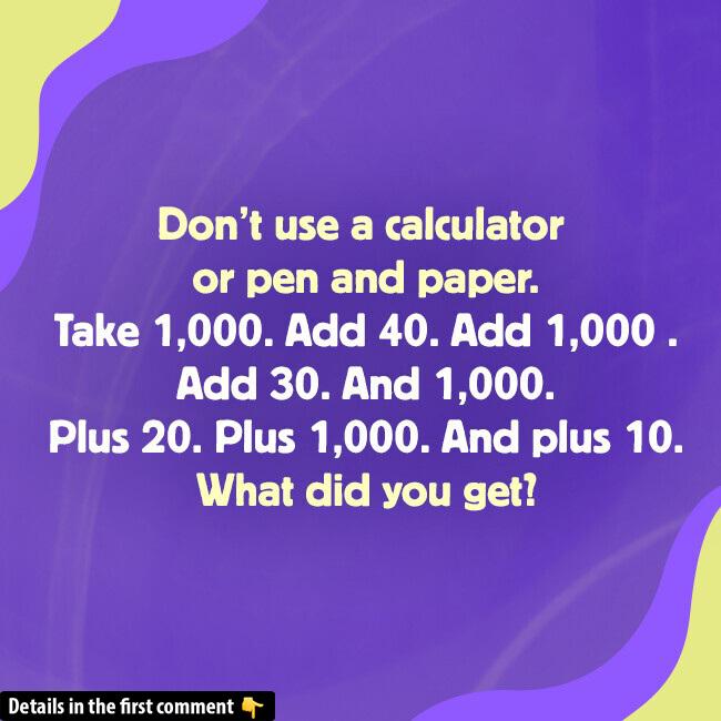 This puzzle isn’t about complex formulas or advanced math. It’s a simple addition problem, but the trick is to do it solely in your head without any external tools. The goal: add a series of numbers carefully to arrive at the final answer. Though it might seem straightforward, many jump to conclusions and end up with a different result than the one hidden in the puzzle. Question: Can you calculate the answer correctly—without a calculator or pen and paper?